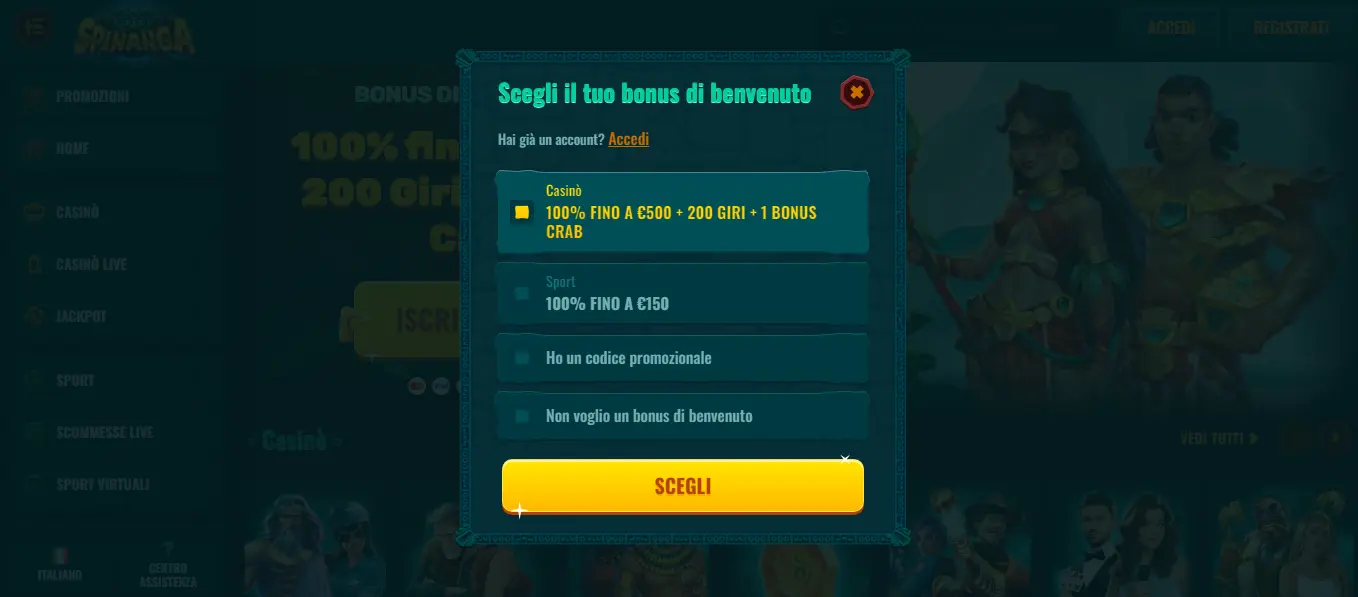 Registrazione e login sul sito di Spinanga casino